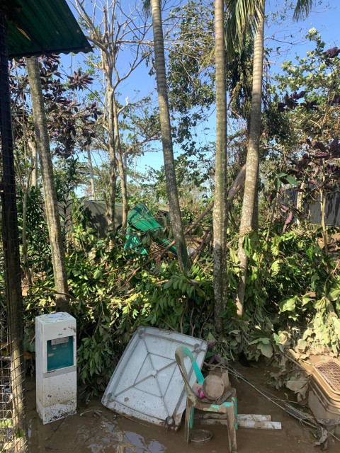 An vielen Stellen sind große Bäume umgestürzt und verursachten Schäden an den Umzäunungen aber auch Unterkünften vieler Mitarbeiter und Gemeindemitglieder. Durch einen über seine Ufer getretenen Fluss entstand eine Sturzflut, welche eine Spur der Verwüstung in den Gehegen und an der Infrastruktur hinterließ und leider auch einigen der brütenden Hornvögeln das Leben kostete. Noch immer sind hier Strom und Wasser ausgefallen.